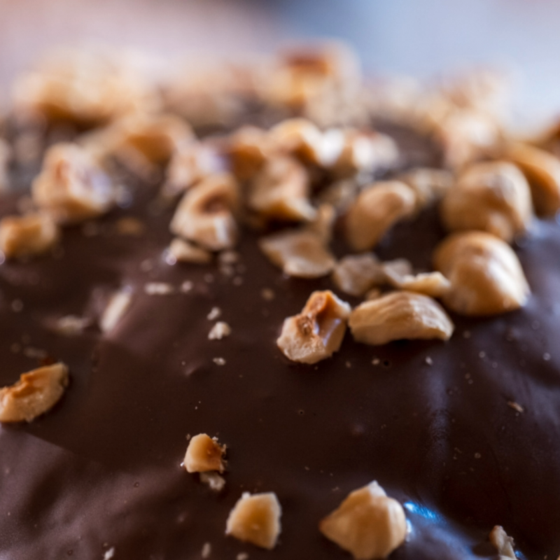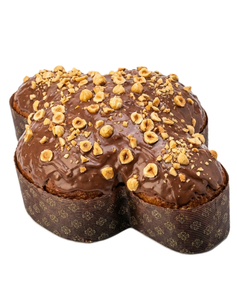 For centuries Italians have baked Colomba as a symbol of Easter. Its name means “dove”, representing peace and hope. This version features a soft leavened dough enriched with butter and delicate sweetness, complemented by a rich hazelnut cream filling and finished with a chocolate glaze topped with crushed hazelnuts, adding a pleasant crunchy note.