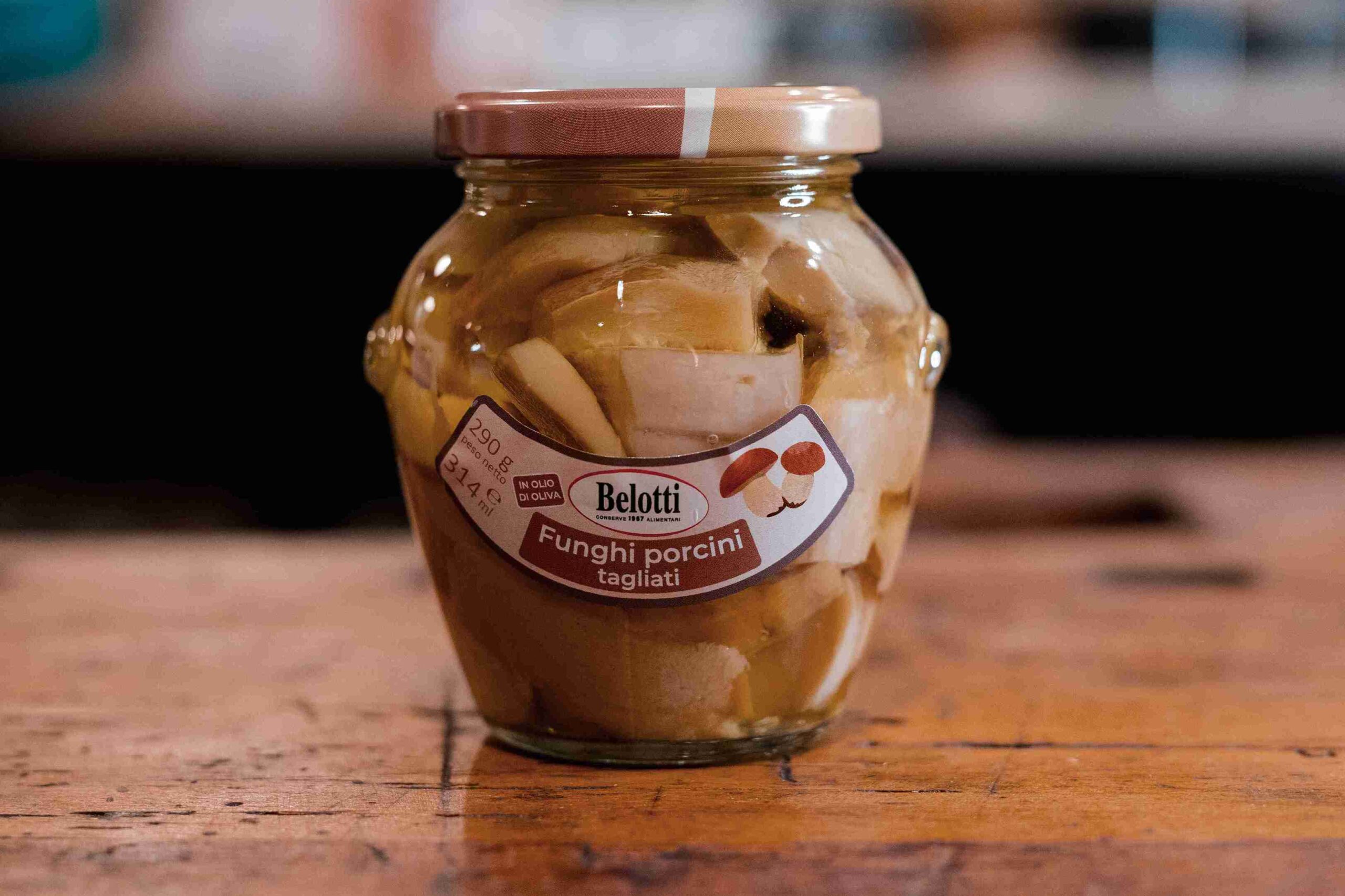 Sliced porcini mushrooms in olive oil. 314ml. Belotti