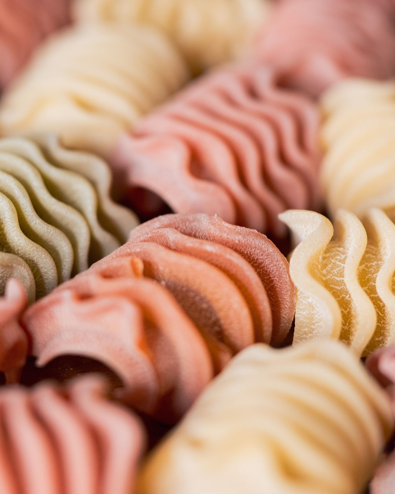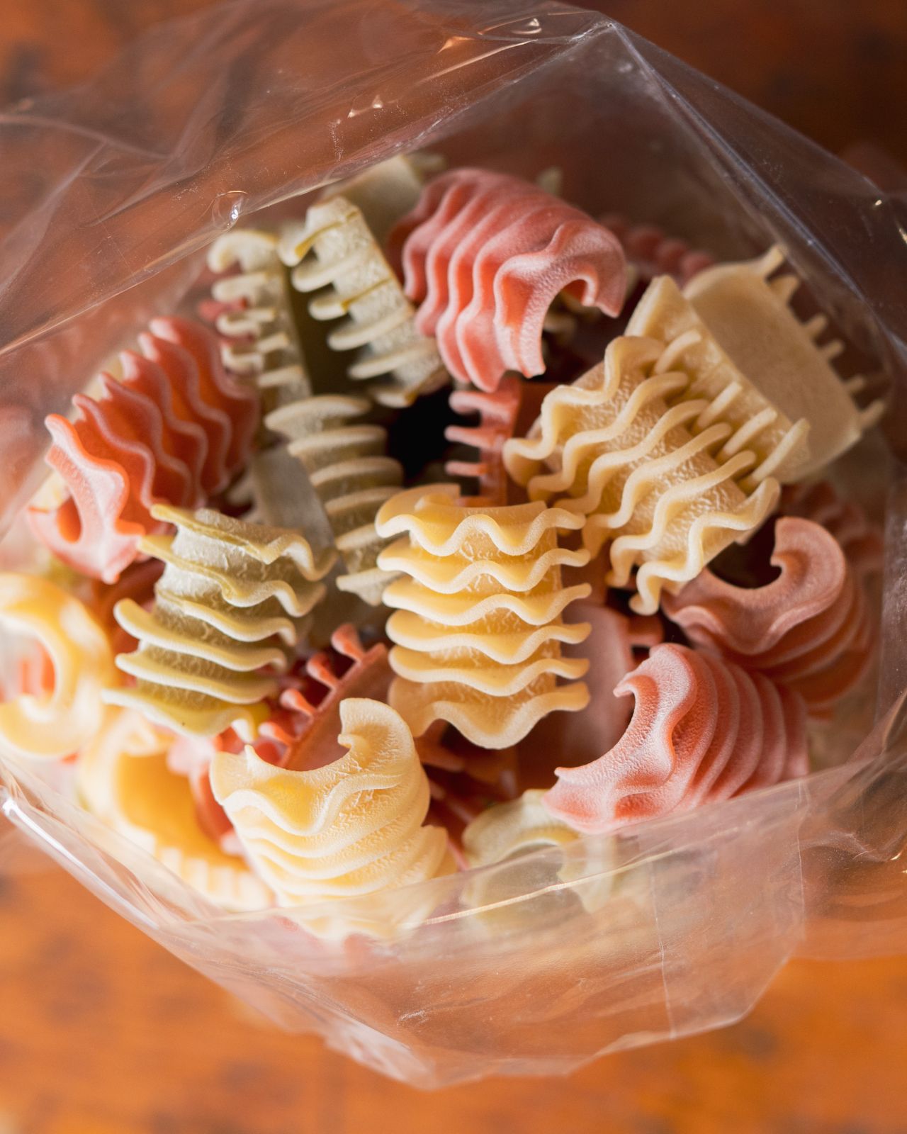 Sestavine: pšenični zdrob durum, voda, dehidrirana špinača (2%), dehidrirani paradižnik (1%), dehidrirana rdeča pesa (1%).